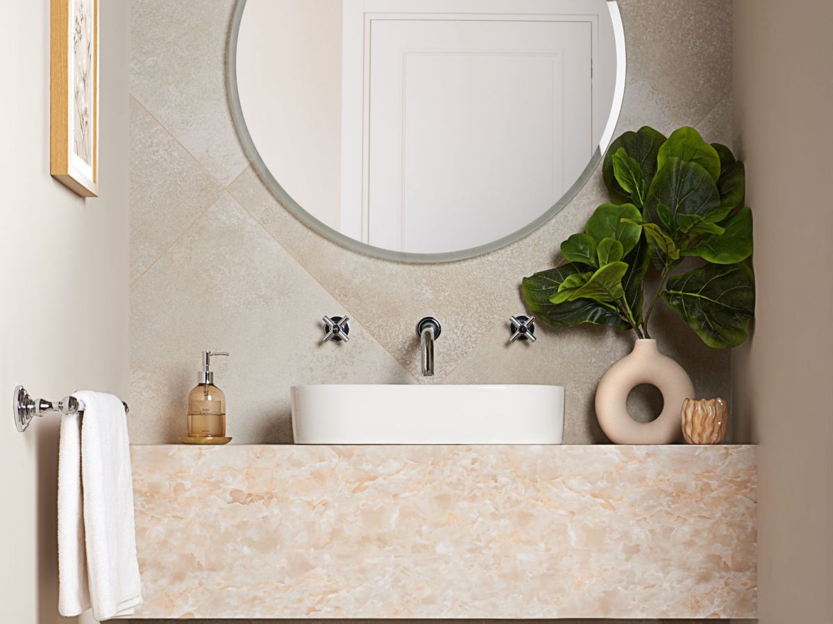Zurückhaltender Luxus: Raffinierte Oberflächen und nachhaltige Materialien wie Stein und Holz aus verantwortungsvollen Quellen schaffen ein dezentes, aber umweltfreundliches Gefühl von Luxus, sagt die Designerin. "Das Hinzufügen von Elementen wie bronzenen Akzenten schafft ein reichhaltiges und doch organisches Gefühl.
