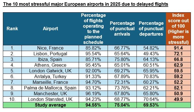 "Vor diesem Hintergrund wollten wir herausfinden, welche Flughäfen in Europa am besten in der Lage sind, Verspätungen und den damit verbundenen Stress zu minimieren. Dabei stellte sich heraus, dass der Flughafen Oslo am besten und der Flughafen Nizza Côte d'Azur am schlechtesten abschneidet.