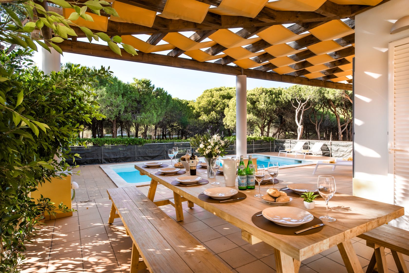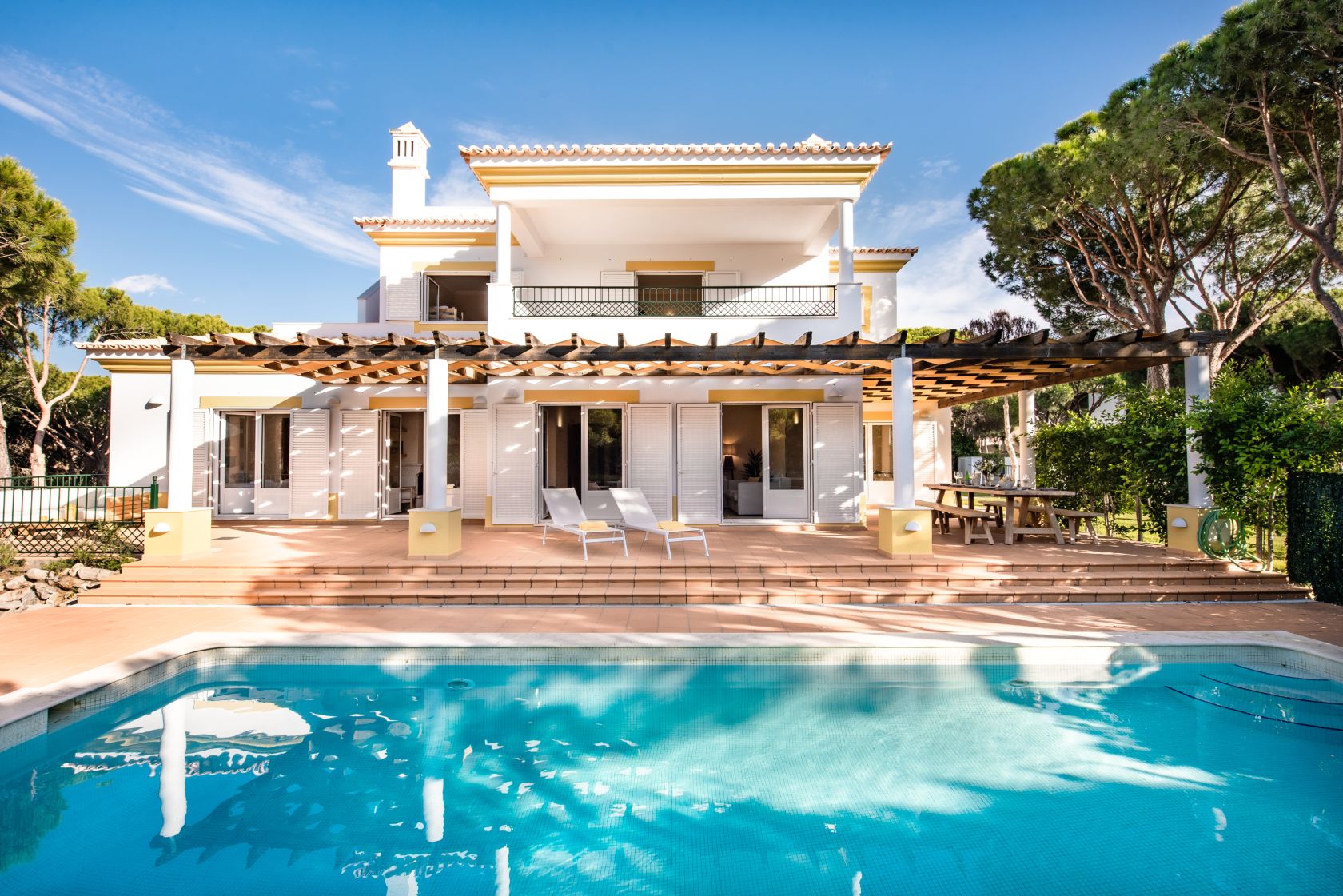 Das Haus strahlt ein mediterranes Ambiente aus, das sich über die großzügigen schattigen Terrassen und den beleuchteten Swimmingpool erstreckt und ein echtes Innen-Außen-Wohngefühl vermittelt.