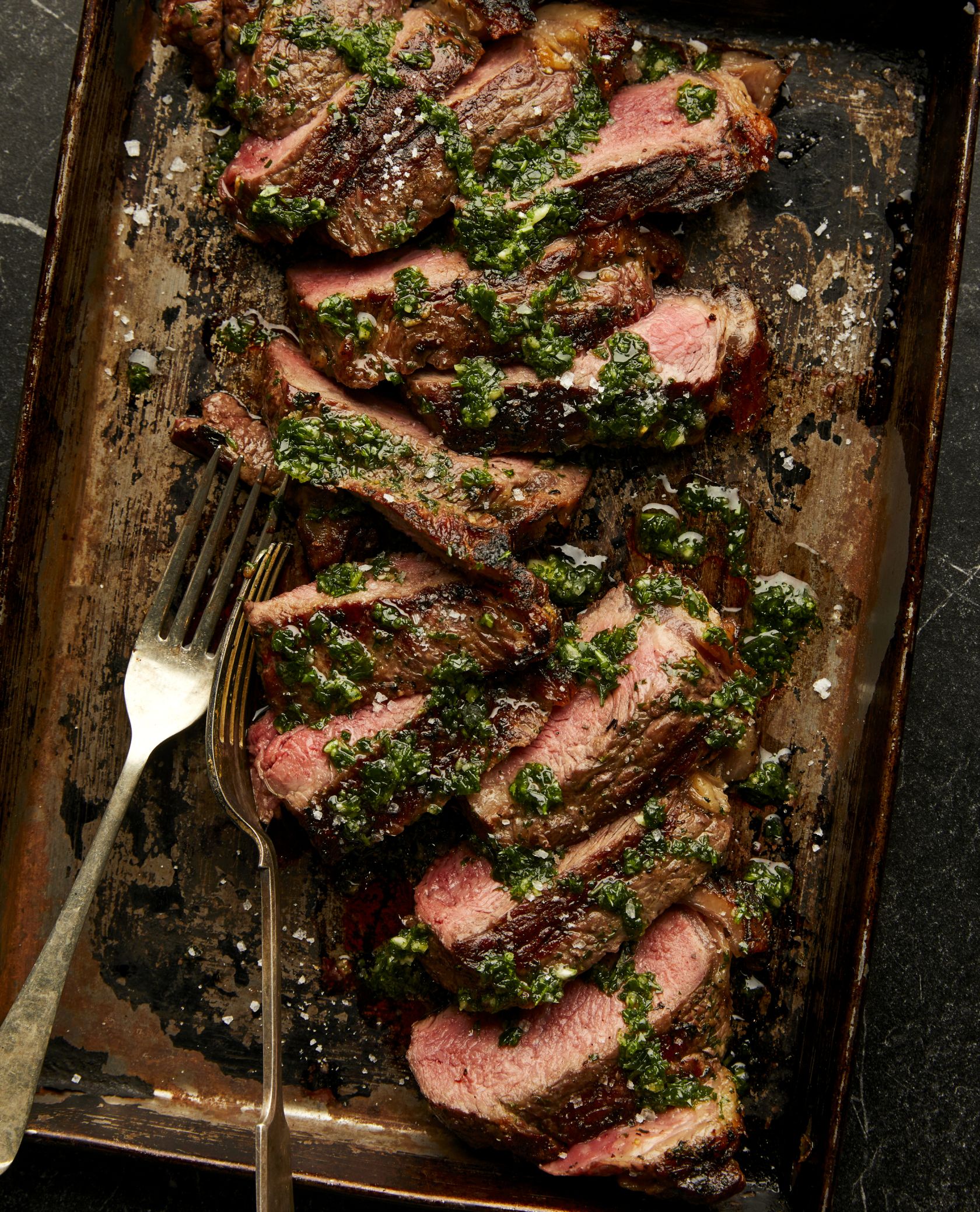 Las patatas fritas y las patatas asadas son los acompañamientos obvios y deliciosos (y si te pones retro, tomates a la plancha y champiñones portobello), pero con la salsa, "te seré sincero, no soy una persona de salsas, así que me gusta tomar mi filete con un poco de sal", dice Ekizian, molestando a los fans de la salsa de pimienta por todas partes. "Si tomo una salsa, será un chimichurri, porque es simplemente genial: orégano, un poco de aceite de oliva".