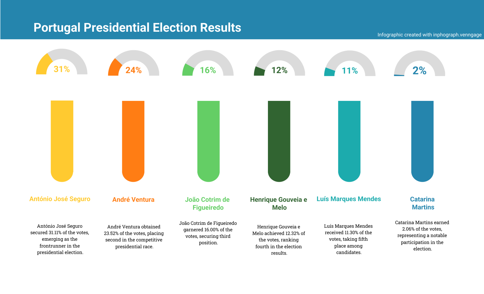 Vuonna 2021 Marcelo Rebelo de Sousa valittiin ilman toista kierrosta 60,71 prosentin ääniosuudella. Tänä vuonna André Ventura varmisti kolmannen sijan Ana Gomesin jälkeen.
