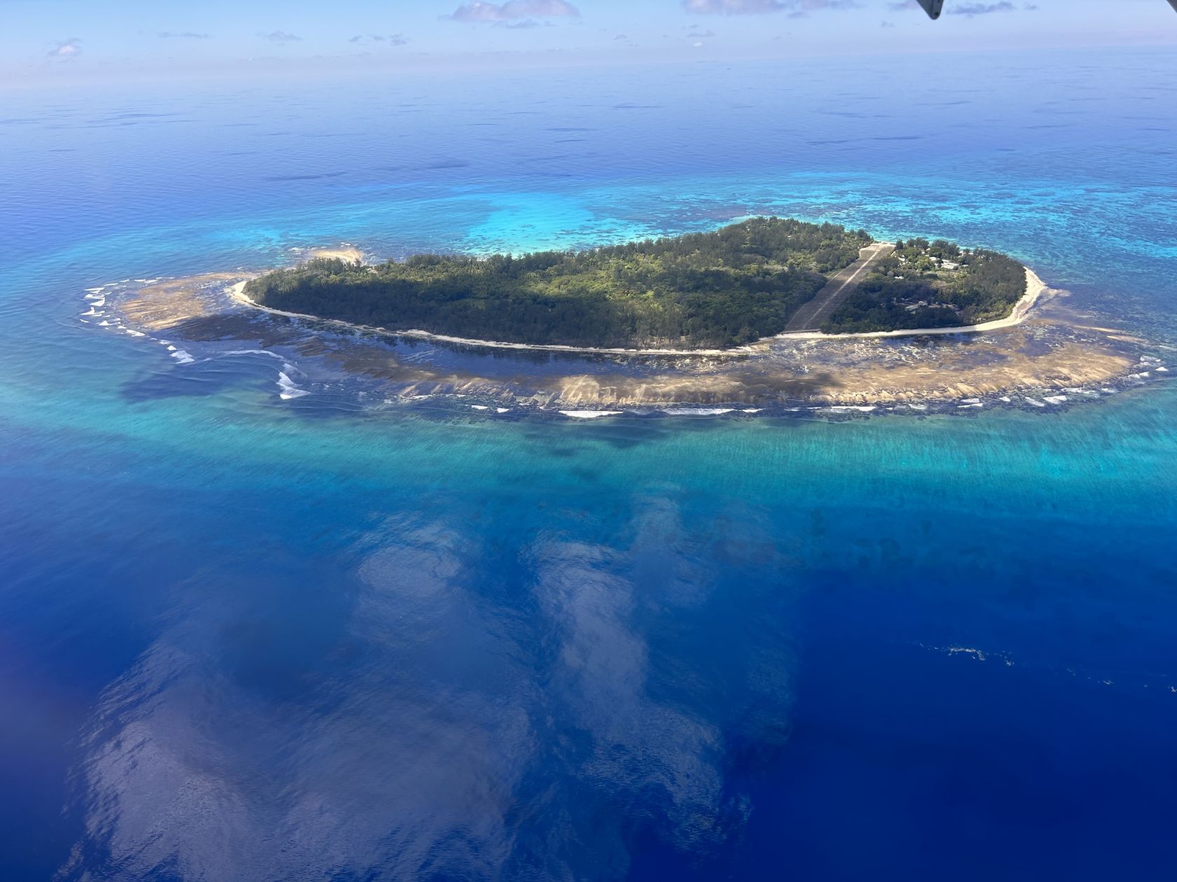 La sostenibilità ambientale è un tema che si estende anche al mio soggiorno a Denis Private Island, dove arrivo dopo essere salito su un minuscolo aereo per otto persone, atterrando su una striscia d'erba che divide l'isola in due.
