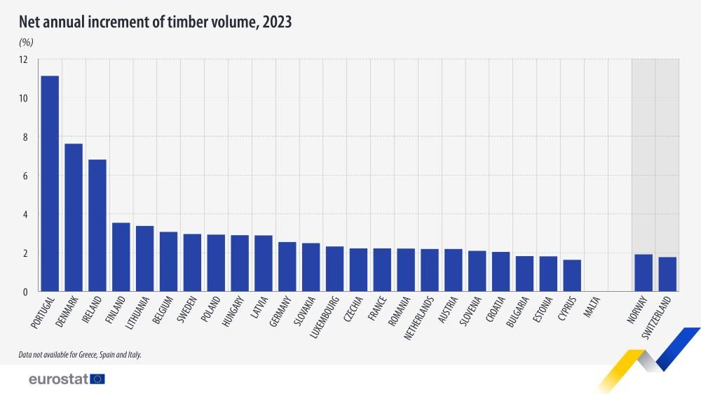 De gegevens dateren van 2023 en laten zien dat Portugal de hoogste bosgroei in de Europese Unie heeft (11,1%), vóór Denemarken (7,6%) en Ierland (6,8%).