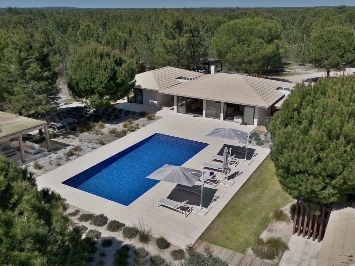 Террасы и ландшафтный сад, окруженный сосновым лесом, обеспечивают абсолютное спокойствие и уединение. Дом оснащен кондиционерами во всех комнатах, парковкой, двумя кладовыми и продается с мебелью, оборудованием и декором.