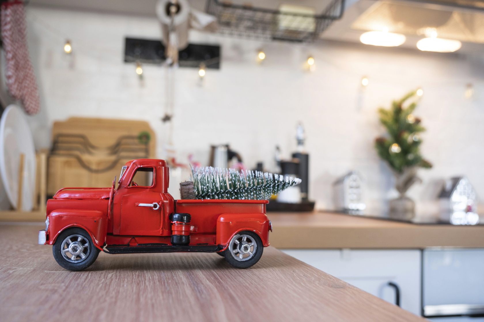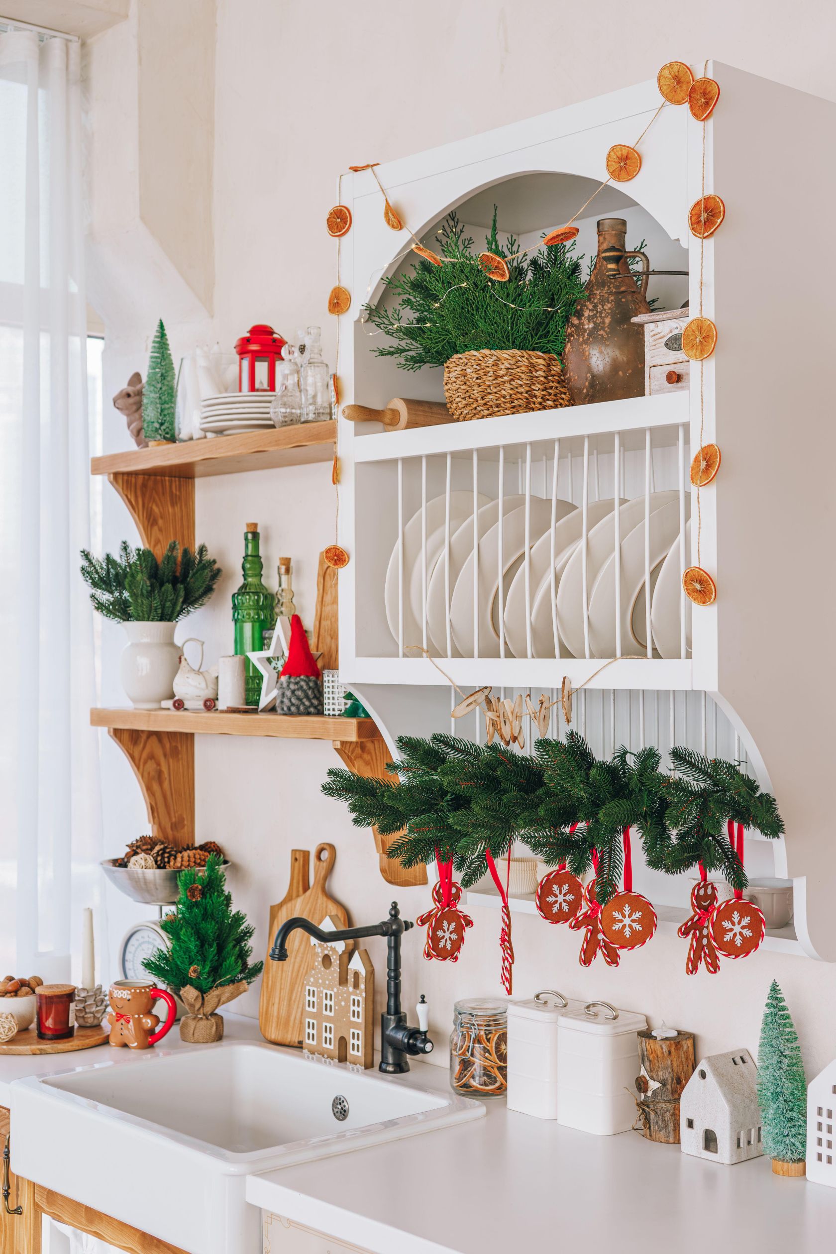 ÂPeri ışıklı çelenkleri dolap üstlerine asın, tezgahın üzerine küçük bir Noel ağacı sergileyin ve cam kavanozları süs eşyaları veya kızılcıklarla doldurun.